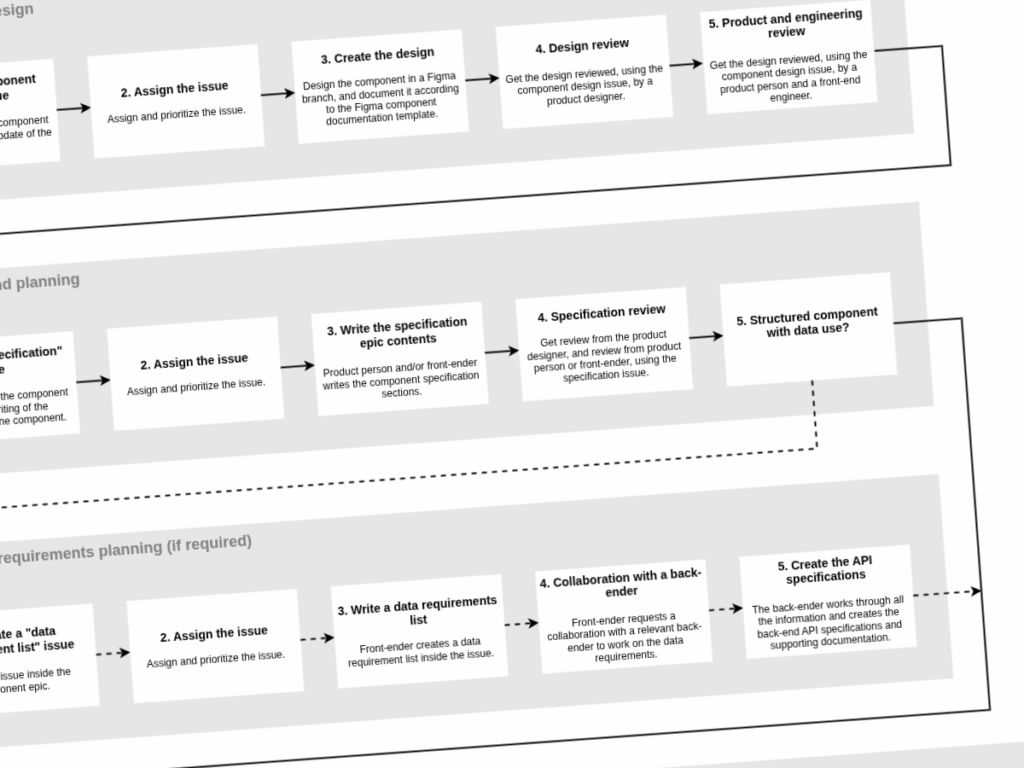 Building user interfaces is never a straight line. Our first step diagram made that impossible to ignore. Almost every step could loop back to a previous one. In the worst cases, the loop ran all the way from the build process back to the very start of design. Without a clear process that kind of rework can spiral into frustration and wasted time, or worse it never gets done at all.